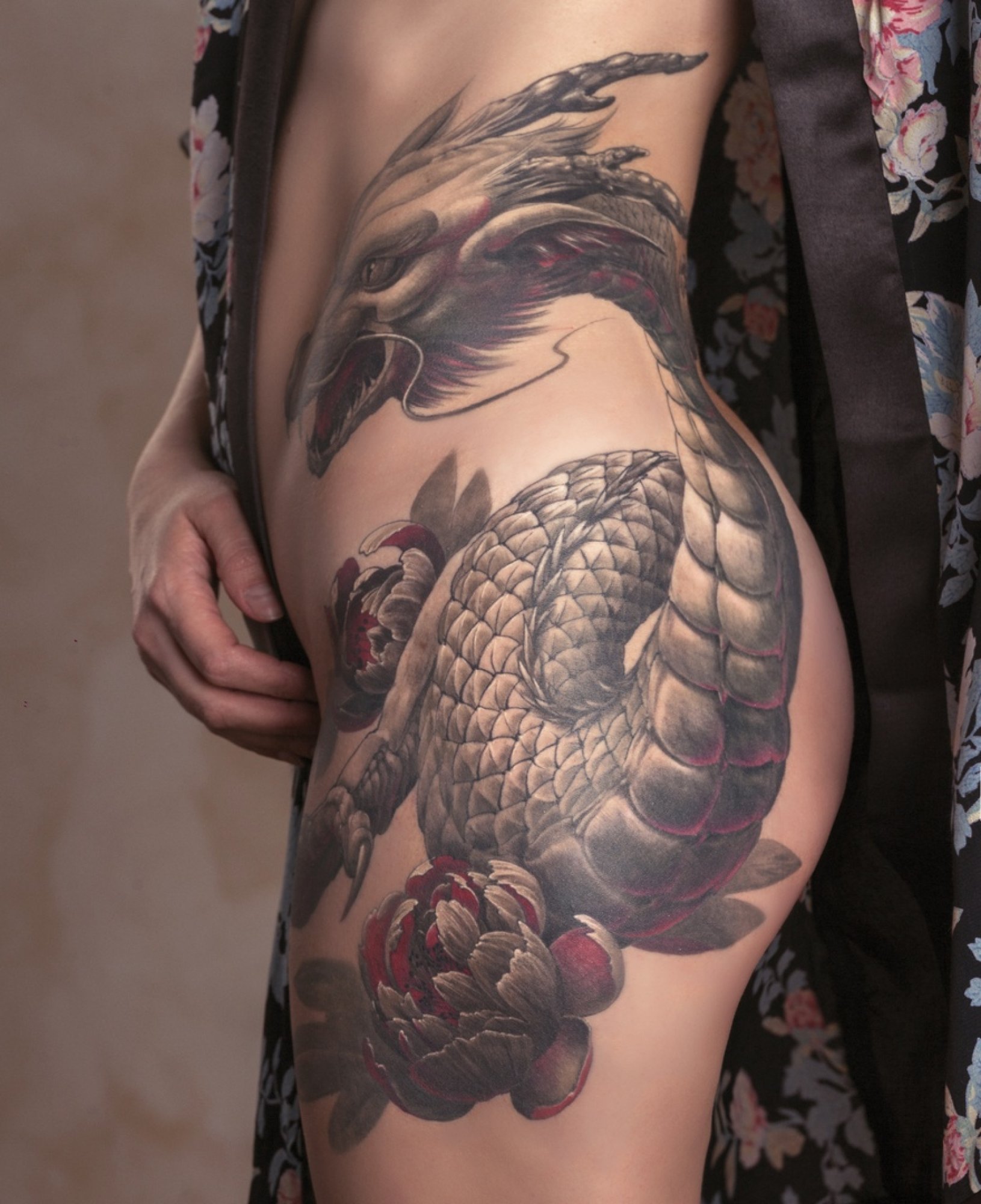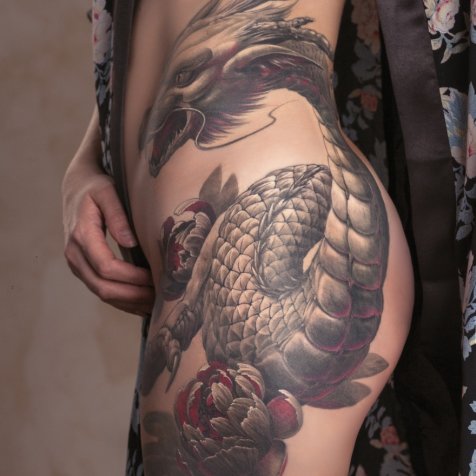 Тату дракон и пионы
